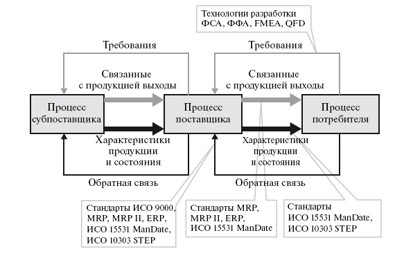 Принятие стратегических документов в области обеспечения качества и повышения конкурентоспособности товаров и услуг (например, глобальной концепции обеспечения качества в ЕС) и связанная с этим необходимость для поставщика товаров и услуг доказывать свою способность к качественному производству товаров и услуг привели к стандартизации основных технологий управления предприятием, разработки продукции, информационного обмена в цепочке поставки. Ряд таких стандартных технологий и стандартов приведен на рис. 1.12.