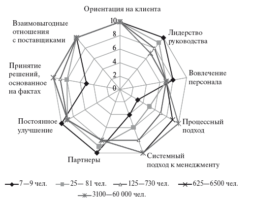 Рис. 1.14. Относительная весомость принципов качественного управления для компаний с разной численностью (диаграмма устойчивости)