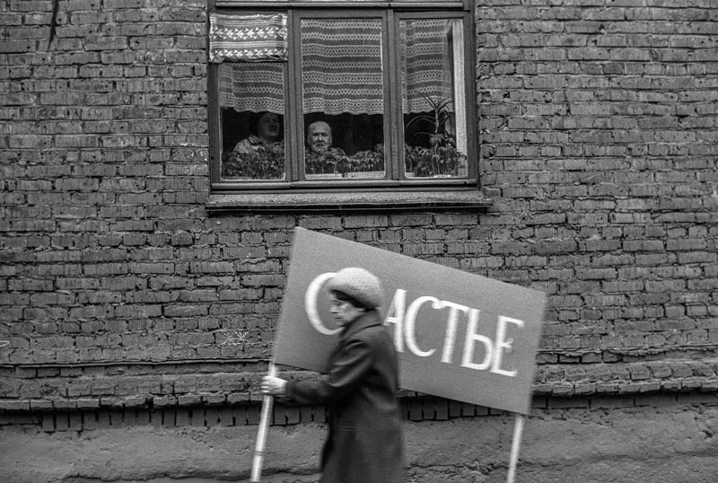 © Владимир Соколаев. Женщина, спешащая на первомайскую демонстрацию. Улица Обнорского. Новокузнецк. 1.05.1983 г.