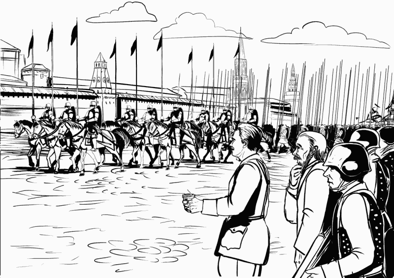 Король ехал по Красной площади, внимательно осматривая выстроенные полевые войска, стянутые сюда для парада, ради чего пришлось разобрать торговые ряды.