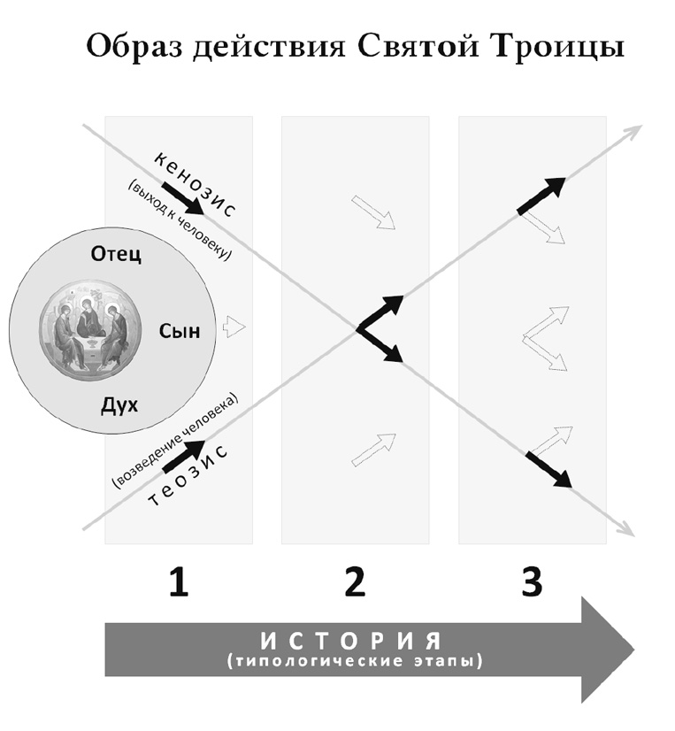 Так, например, представленная типологическая картина исторического проявления образа действия (τρόπος τῆς ἐνέργιας) Лиц Святой Троицы по отношению к миру и человеку может быть осмыслена через взаимное отношение понятий «первообраз» и «образ»[100], где домостроительная прообразовательная связь образа со своим первообразом (отпечатление первообраза в образе), с одной стороны, и возводящее человека познание первообраза через образ, с другой стороны, представляются двумя неразрывными гранями единой реальности[101]. (Следует, однако, заметить, что в отличие от нисходящего вектора, представляющего некоторую онтологическую последовательность, отображённую в домостроительном порядке (Отец, Сын, Святой Дух), восходящий вектор представляет собой исключительно домостроительный компонент[102].)