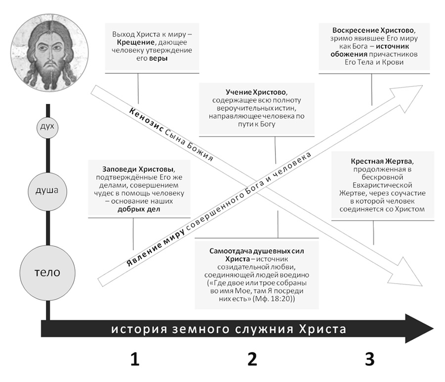 Отдельно следует сказать о пути земного служения Христа, выступающего непосредственной парадигмой исторических процессов, совершаемых человеком и человечеством. Хотя образ действия Святой Троицы в целом (τρóπος τῆς ἐνεργείας) прообразует процессы, совершаемые в человеке и его истории, однако именно путь Христа – не только Бога, но и человека – становится непосредственным образцом для подражания, доступным нашему восприятию, в человеческой истории.
