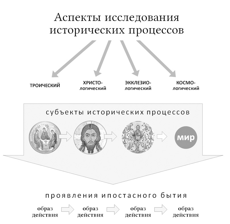 Итак, рассмотрев общие вопросы об исторических силах и их отношении ко Святой Троице как собственному прообразу, мы можем предложить следующую универсальную модель для анализа исторических процессов. Экклезиологический и экклезиобежный процессы, происходящие в истории, представленные в данной модели, являют в себе предельную полярную фокусировку, можно сказать, наиболее чистый вид осуществления исторических законов; «серая» ткань истории при разложении её на составные «элементы», охватывается этими процессами (ср.: Мф 12:30; Лк 11:23; Мф 10:34 и др.).