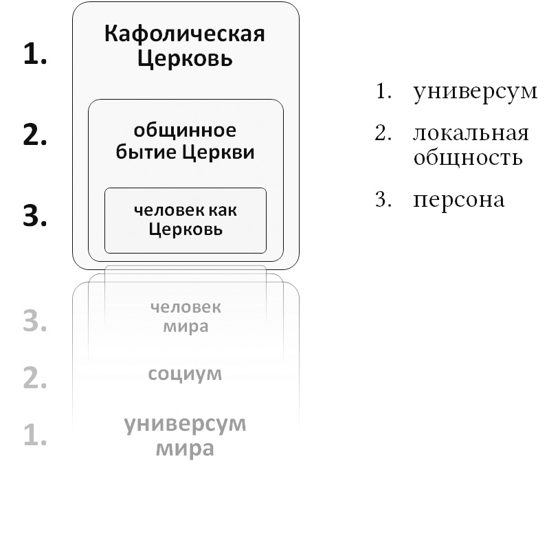 Движение от персонального к кафолическому представляет собой путь внутреннего развития человека как Церкви, представляет его историческую задачу. Начинаясь с особого и действующего «снизу», в теле церковном, т. е. в человеке, участия Святого Духа, собирающего церковных членов, этот путь заканчивается измерением кафоличности, усвоенным по причастию отдельными человеческими ипостасями, т. е. приведением всех к Отцу (1 Кор 15:28).