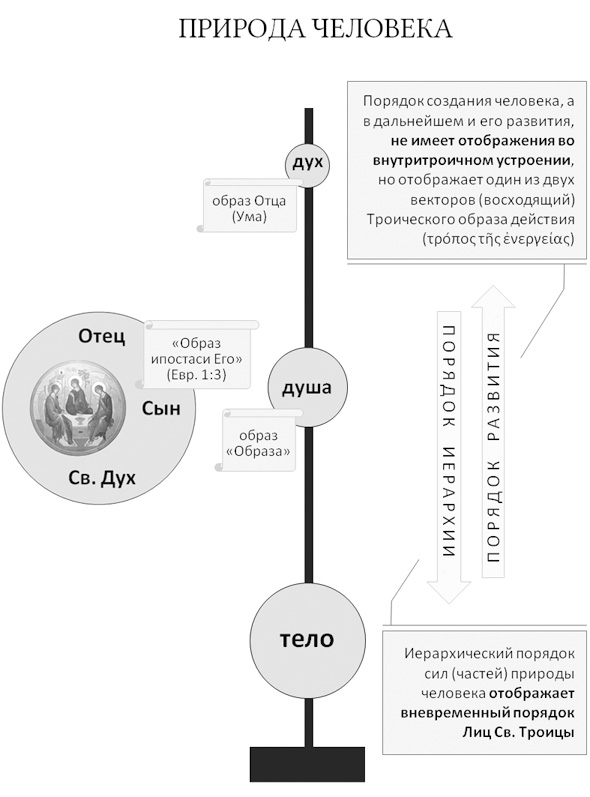 Косвенно подтверждает эти мысли и представленное у свт. Григория реверсированное последование «трёх природ» человека (тела, души и духа[175]), иллюстрирующее процесс его творения: создаваемая Богом «природа (человека) как бы из ступенек… совершает путь восхождения от самого малого к совершенному (т. е. от тела к уму (духу))», после чего «в словесном (т. е. в уме), заключаются и остальные (природы)»[176]. Путь «исторического» создания[177] типологически соответствует здесь пути дальнейшего исторического вызревания человека и восхождения его к Богу. Само творение человека, хотя и действительно совершалось в восходящем порядке от тела к духу, однако в замысле Божием имело обратный порядок, – двухвекторность этой последовательности коррелирует с двухвекторностью домостроительного обращения Божия к человеку[178], которое, в свою очередь, отображает таинственные отношения между Лицами Святой Троицы, включая сам порядок Троических Лиц.
