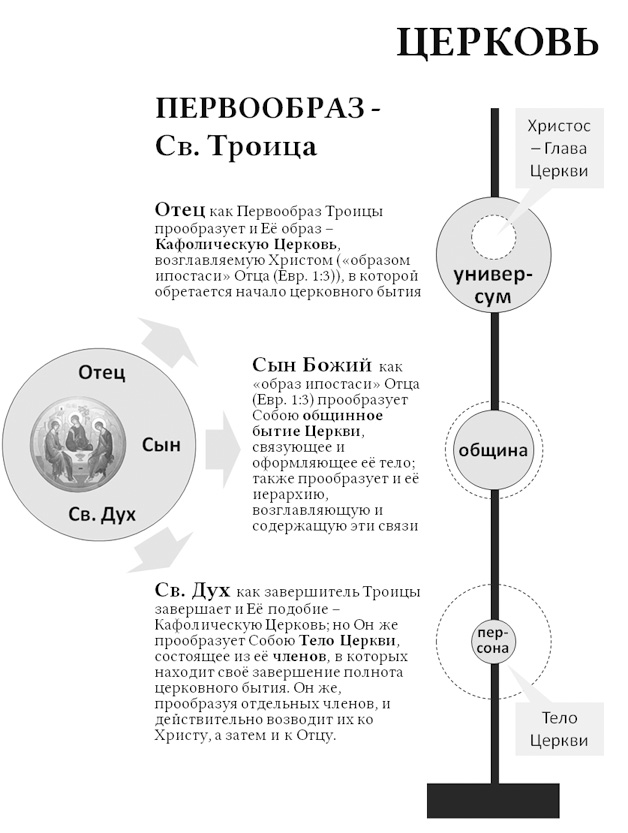 В следующем изображении представим некоторую корреляцию ипостасного устроения Церкви (а значит, и Человека[181]) со Святой Троицей, не претендуя, однако, на какую-либо безальтернативность и полноту раскрытия данного вопроса, но, скорее, имея в виду его практическое значение для дальнейшего построения исторических типологических моделей.