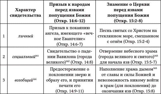 3. Утверждение христоподобного пути Церкви в истории и рост её торжества. В течение времени «знамения печатей» – от воцерковления мира (Откр. 6:1), к запечатлению Церкви, уберегающему от казней (Откр. 7:3), и соучастию святых в приготовляемых наказаниях мира Богом (Откр. 8:3–5). В период казней – от избавления запечатлённых от страданий (Откр. 9:4)[159], через власть над стихиями (Откр. 11:3–6), до соделывания «Царства мира… Царством Господа нашего и Христа Его» (Откр. 11:15)». В период последних язв – от стояния на «море, смешанном с огнём» (Откр. 15:2–4), через «бодрствование и хранение одежды своей» (Откр. 16:15), к браку Церкви и Агнца, брачной вечере (Откр. 19:9).