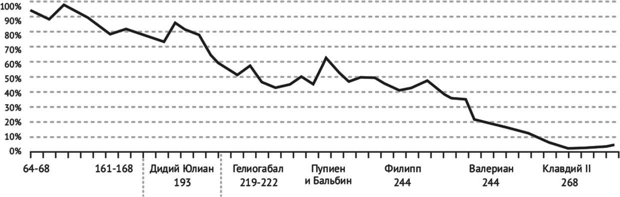 Иберийские шахты истощились, а новых месторождений серебра на всей громадной территории империи отыскать не удалось. Между тем выпуск новых монет (эмиссионный доход) составлял существенную часть бюджета империи – именно за счет него, а не за счет собираемых налогов финансировалось содержание римских легионов и спрос римских граждан. В свою очередь, римские легионы поддерживали целостность империи, обеспечивая единое торговое пространство. График показывает, как отреагировали римские императоры на сокращение добычи серебра: они стали портить монету.