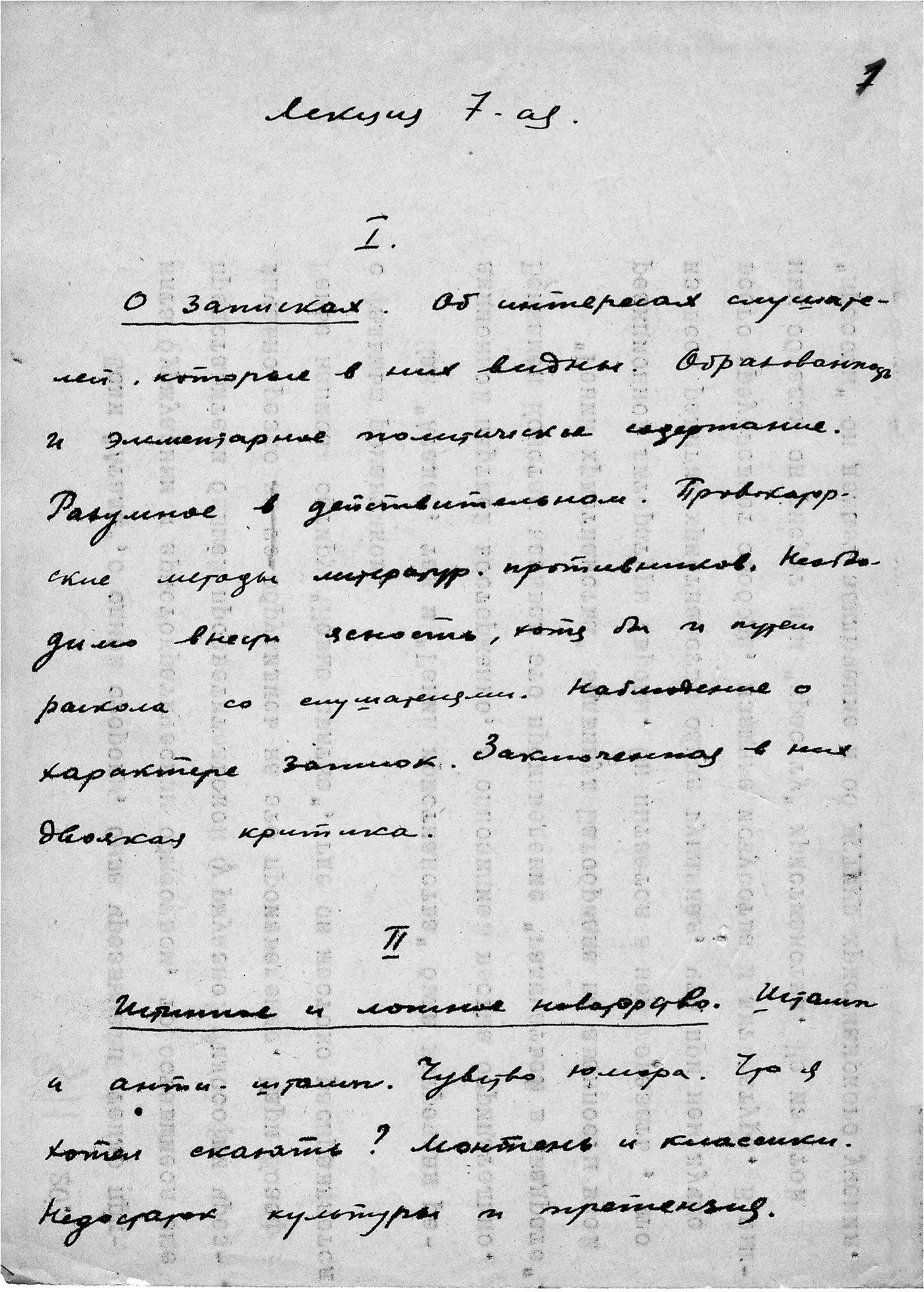 «А всё-таки без этого периода не пойдёшь дальше, а всё-таки, если хочешь создавать социалистический реализм66, то его нужно сделать так: взять, скажем, в живописи какую-нибудь современную тему и взять ма́стерскую форму, а ма́стерскую форму взять у тех людей, которые развенчивали старое классическое искусство». Или так: «Нужно взять что-то, конечно, из классического наследия. Нужно учиться у Толстого, но нельзя забывать в то же время и то, что и в этот период, в период разрушения старых форм, в период декадентства и так называемой револю ции в искусстве была произведена очень важная чистка, и эту чистку старых форм и установлений каких-то новых приёмов необходимо перенести и в наши понятия о социалистическом реализме».