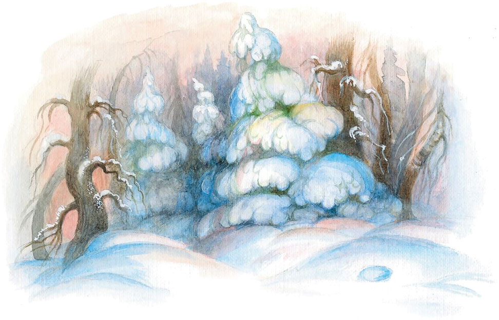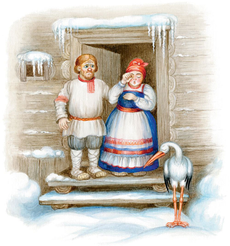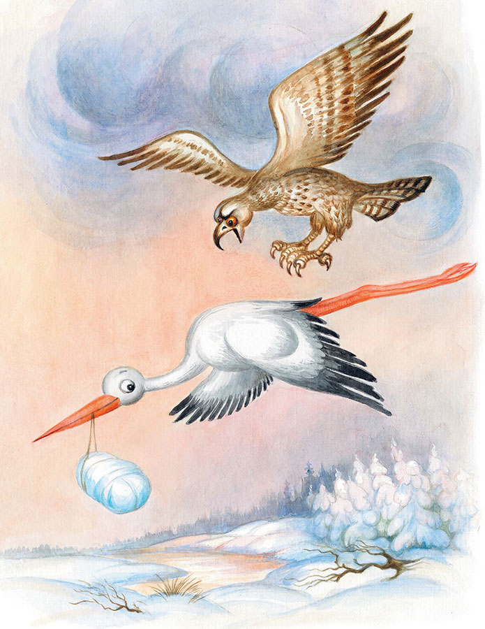 Летит аист – и вдруг с неба на него налетает ястреб. Бьёт ястреб аиста острым клювом, а аист от него уворачивается, пытаясь уберечь драгоценную ношу. Но вот ястреб со всей силы клюнул аиста в голову – и выронил аист ребёнка. Полетел спелёнатый ребёнок вниз. Вот-вот разобьётся. Но спружинили его ветки ёлки, и упал он в наметённый около неё сугроб. Упал ребёнок и заплакал. Тоненько-тоненько, как умеют плакать только новорождённые дети. А аист стал сражаться с ястребом, клюнул его в голову, ястреб закричал от боли и улетел. Аист стал летать над лесом, разыскивая ребёнка. Не может найти. И вот он уже стоит перед раскрытой дверью избушки и виновато отворачивает голову. Заплакала женщина, а муж её утешает.