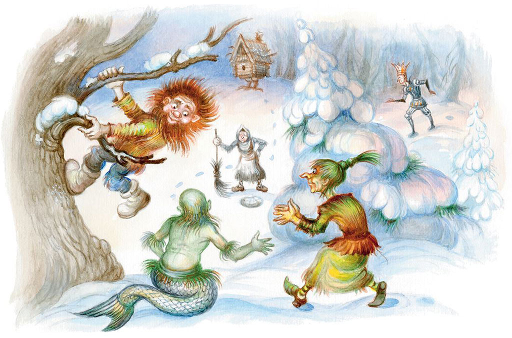 А на звук плача сквозь сугробы пробирается избушка на курьих ножках, скользит по сугробам, руля рыбьим хвостом, Водяной, по веткам деревьев прыгает Леший, кряхтя, по сугробам пробирается Кощей Бессмертный, бежит и Кикимора Болотная.