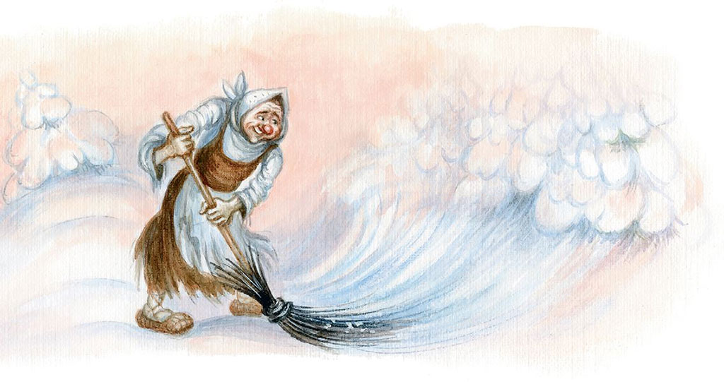 Первой добралась до сугроба избушка на курьих ножках. Выскочила из избушки Баба-яга и стала своей метлой разгребать сугроб над плачущим звуком. А потом подтянулись и все остальные. Разгребла Баба-яга сугроб, и все увидели свёрток с плачущим ребёнком.