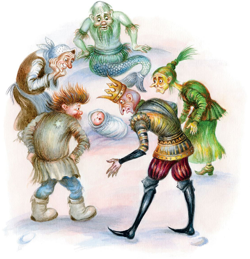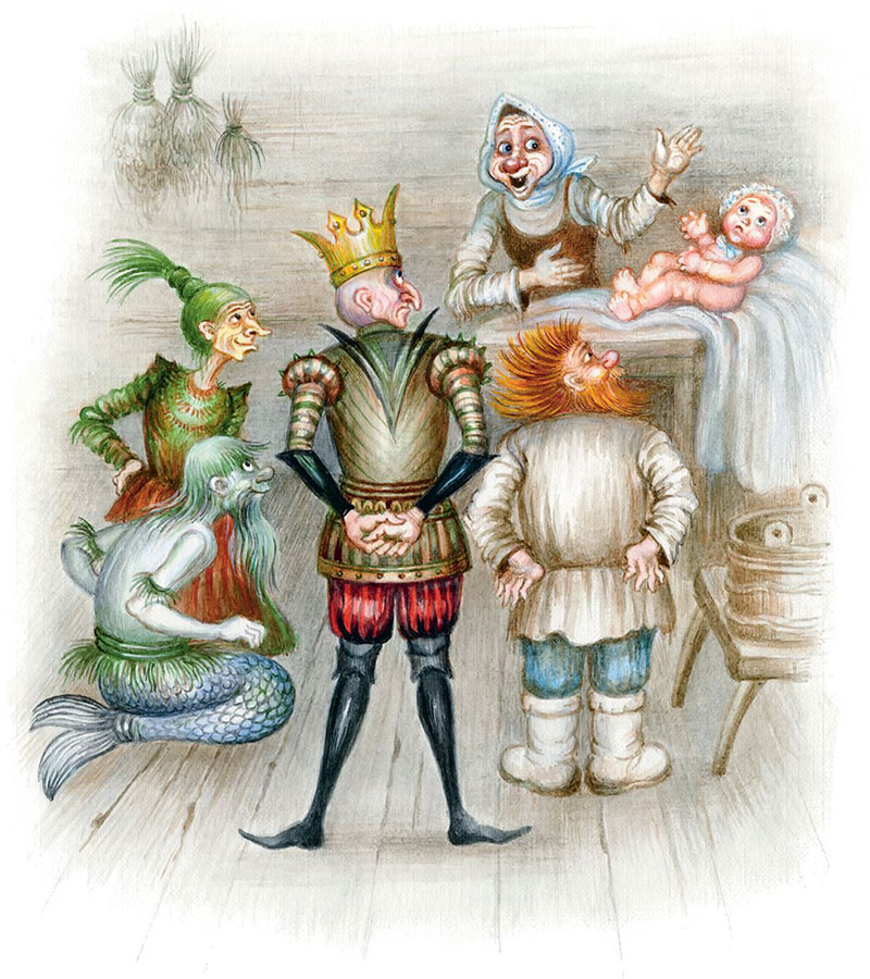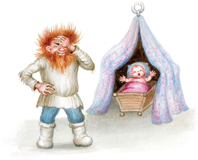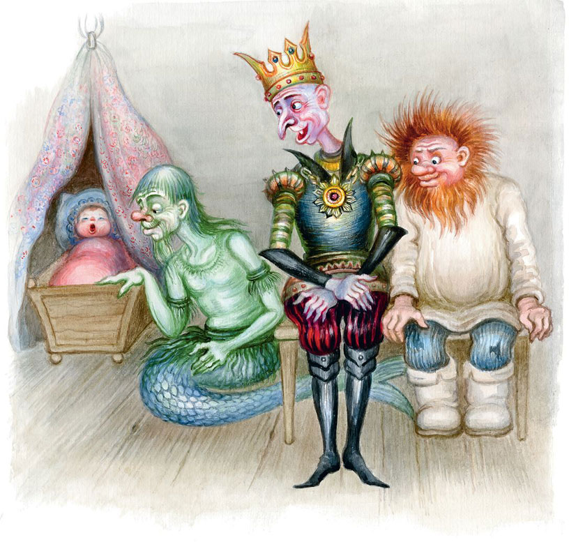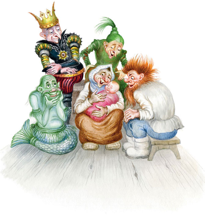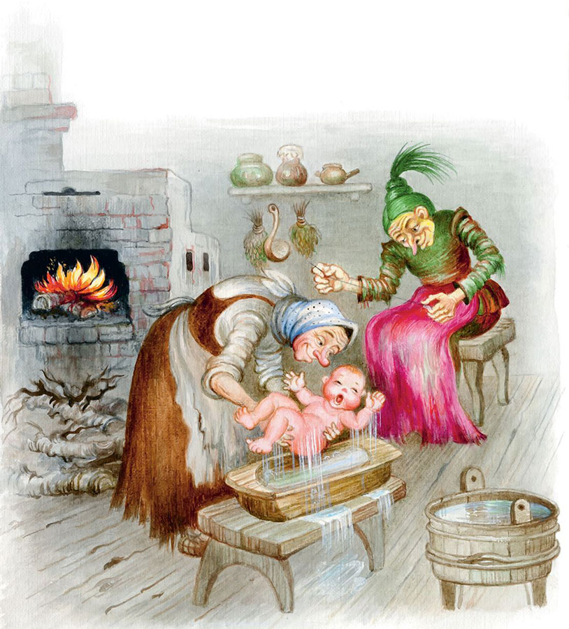 И вот уже Баба-яга полощет девочку в корыте, Кикимора шьёт из лоскутов платья пелёнки, а остальные делают из досок люльку. И вот уже Водяной качает люльку с девочкой.