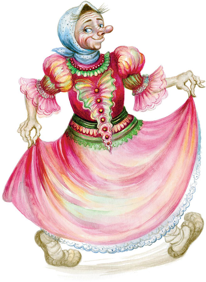 Бросилась Баба-яга к сундуку, заворочалась в нём, да так, что свалилась в него, только ноги торчат. Вытянули её Водяной и Леший, а у Бабы-яги в руках платье невиданной красы. Примерила она его на себя, прошлась горделивой походкой и пояснила: