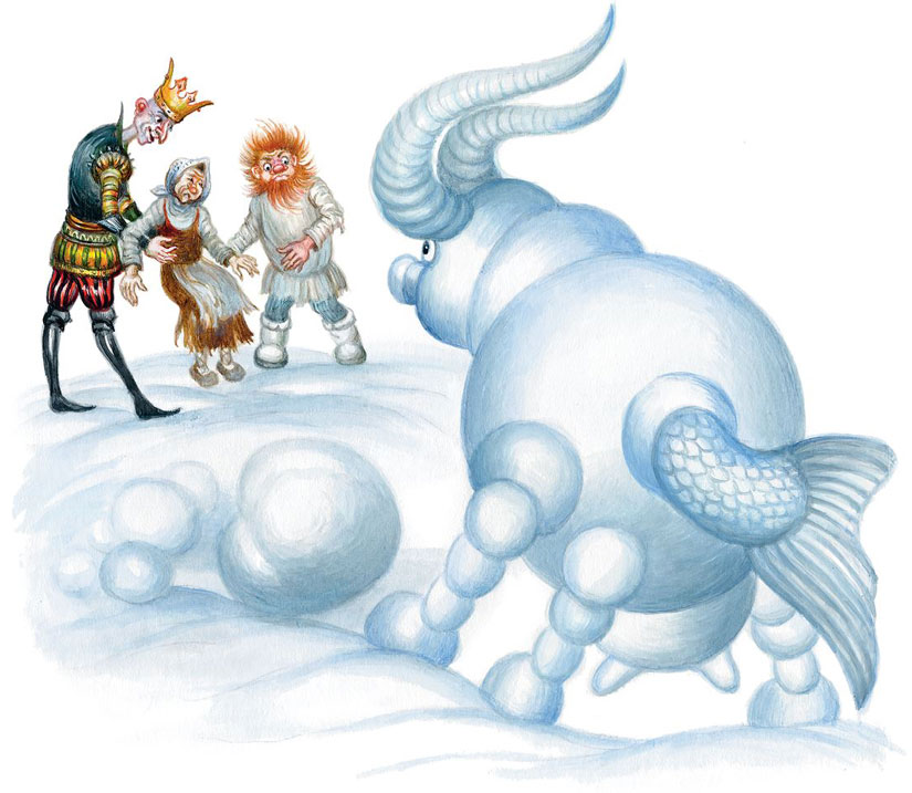 И тут на крыльцо выскочила Баба-яга, увидела непонятное снежное чудище, осела и обязательно упала бы от ужаса, но Кощей и Леший её поддержали, а Кикимора сказала: