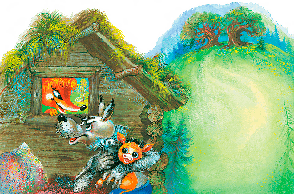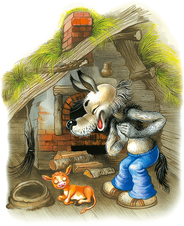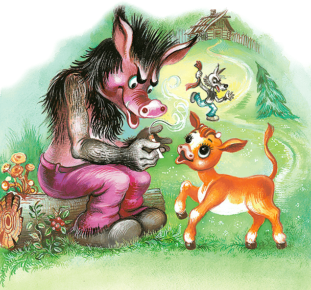 Однажды Волк украл в деревне Телёнка. Засунул в мешок и принёс к себе в избу. А там решил съесть его не спеша и с удовольствием. Вытряхнул из мешка и ахнул: