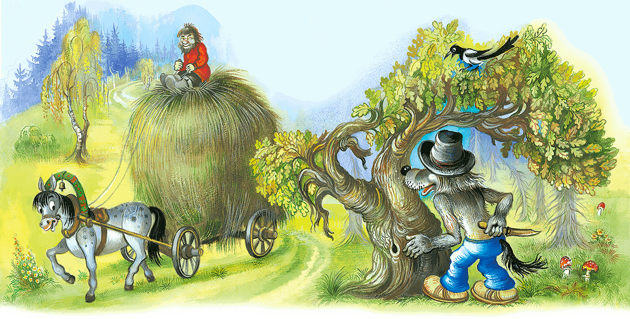 Спрятался он в кустах у лесной дороги. Смотрит, едет по дороге мужичок с возом сена. Выскочил Волк-разбойник на дорогу: в шляпе, на глазах – маска и ножик в лапе! И прохрипел:
