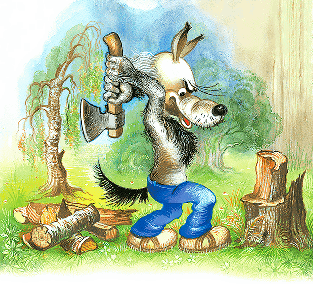 Тут уж Волк всерьёз озаботился. Раз он родитель, значит, и вести себя надо солиднее… И вот пошёл он в деревню. Стал во дворы заглядывать. Видит, в одном мужичок начал дрова рубить, да умаялся. Сел на завалинку, пригорюнился. Волк тут как тут: разрешите, мол, помочь!