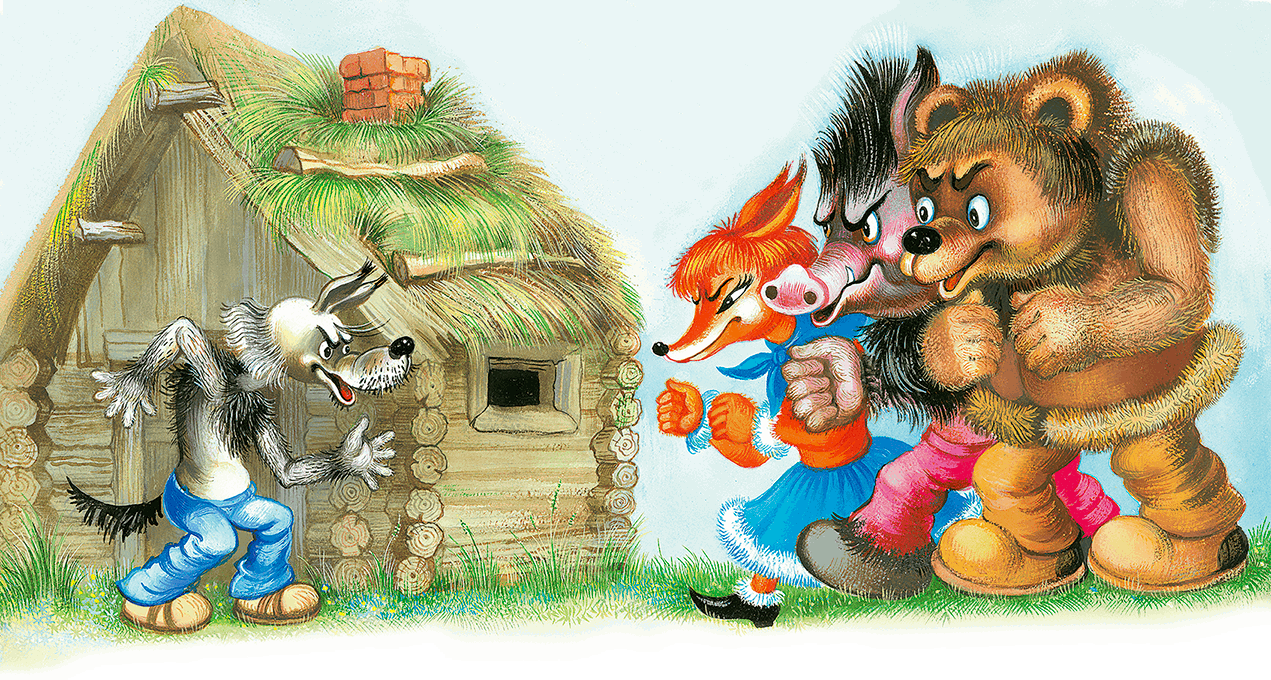 Принёс Волк бадью домой, а тут Кабан, Лиса и Медведь появились.