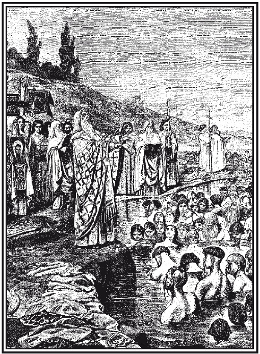 По сем назначил Владимир день всему народу киевскому для приятия святого крещения, объявив, что ежели кто в установленное время не явится на реке Почайной, тот Господу Богу Иисусу Христу и ему будет противник. Собралось неисчислимое множество народа на указанный день и место. И сам великий самодержец со всем синклитом и освященным собором украсил присутствием великое сие действие и чудное позорище. При береге на плотах стоят облаченные священники и диаконы, река наполнена обнаженными людьми всякого возраста и пола: иные в воде по колена, иные по пояс, другие по шею – моются, купаются, плавают. Между тем читают крещальные молитвы; каждый по особливом погружении получает в крещении имя и помазание миром.