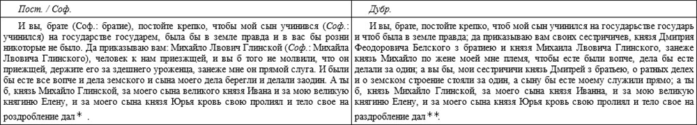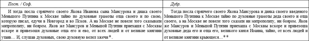 Эти разночтения стали предметом продолжительной научной дискуссии. А. А. Шахматов обратил внимание на то, что в Соф. (Пост. тогда еще не был введен в научный оборот) сначала сообщается о сожжении в пятницу Василием III своей духовной, а затем говорится о том, что в субботу великий князь велел Меньшому Путятину тайно принести духовные грамоты «и пусти в думу к себе к духовным грамотам дворецкого своего тферскаго Ивана Юрьевича Шигону и дьяка своего Меншого Путятина, и нача мыслити князь велики, кого пустити в ту думу и приказати свой государев приказ»94. Но если работа над составлением завещания началась только в субботу, то, по мнению Шахматова, предшествующее сообщение Соф. о сожжении великим князем своей первой духовной грамоты является позднейшей вставкой, а первоначальную редакцию Повести точнее передает текст Дубр.95