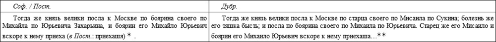 Приведенный эпизод одинаково изложен во всех трех летописях, далее, однако, начинаются разночтения. В Пост. и Соф. затем рассказывается о посылке по приказу великого князя в Москву за боярином Михаилом Юрьевичем Захарьиным, который вскоре приехал на Волок. В Дубр. же говорится о посылке за старцем Мисаилом Сукиным и боярином М. Ю. Захарьиным; ср.: