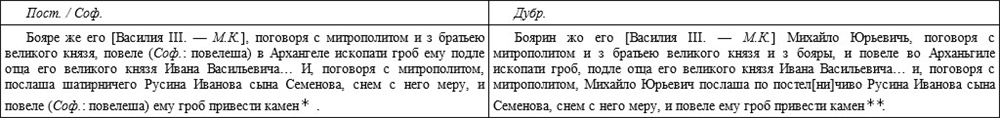 В обеих версиях (и в Пост., и в Дубр.) можно заметить несогласованность глаголов с существительными: в первом случае с существительным множественного числа («бояре») дважды употреблен глагол («повеле») в единственном числе, во втором случае – наоборот: рядом с подлежащим в единственном числе («Михайло Юрьевич») стоит сказуемое во множественном числе («послаша»). Таким образом, обе версии сохранили следы редакционной правки. Если учесть, что согласованность глагольных форм с существительными наблюдается только в Соф., а там все распоряжения исходят от «бояр», то можно предположить, что именно этот список сохранил первоначальный текст данного фрагмента Повести. Выше уже было отмечено особое внимание составителя Дубр. к фигуре боярина М. Ю. Захарьина, и подчеркивание его роли на похоронах великого князя является, по-видимому, еще одной вставкой, характерной для этой версии памятника.