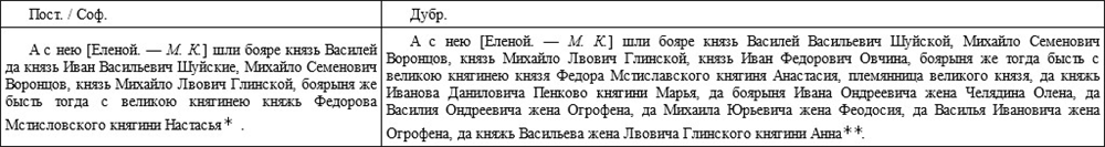То, что указанный пропуск имени одного из бояр носил механический характер, а не выражал какой-то политической тенденции, явствует из последующего текста, который читается одинаково и в Дубр., и в Пост./Соф.: «И поидошя от него [Василия III. – М. К.] бояре. А у него остася Михайло Юрьев [Захарьин. – М. К.] да князь Михайло Глинской, да Шигона и бышя у него до самые нощи. И приказав о своей великой княгине Елене и како ей без него быти, и как к ней бояром ходити. И о всем им приказа, как без него царству строитись»141.