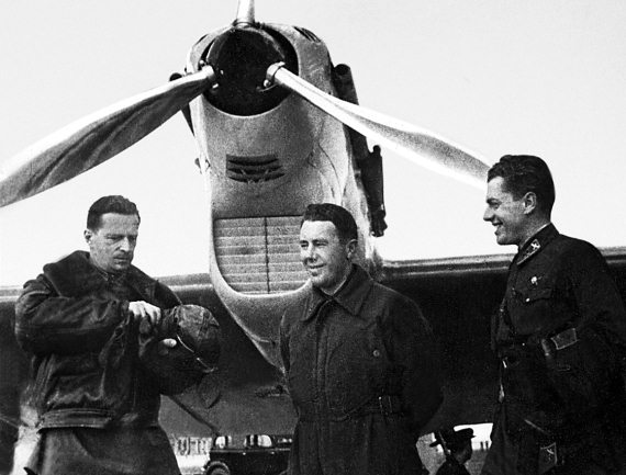 Михаил Громов, Иван Данилин и Андрей Юмашев во время подготовки к дальнему перелету в июле 1937 г.