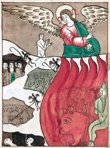 Рис. 3. Ангел показывает душе умершего преисподнюю. В пламени на огромном звере сидит Сатана. Он одновременно повелитель ада и его узник – его ноги и руки за спиной связаны. Кто-то из читателей оставил у него лице дырку, через которую виден следующий лист.