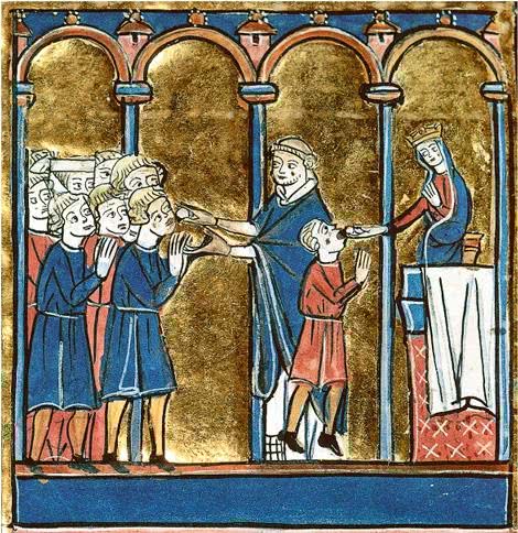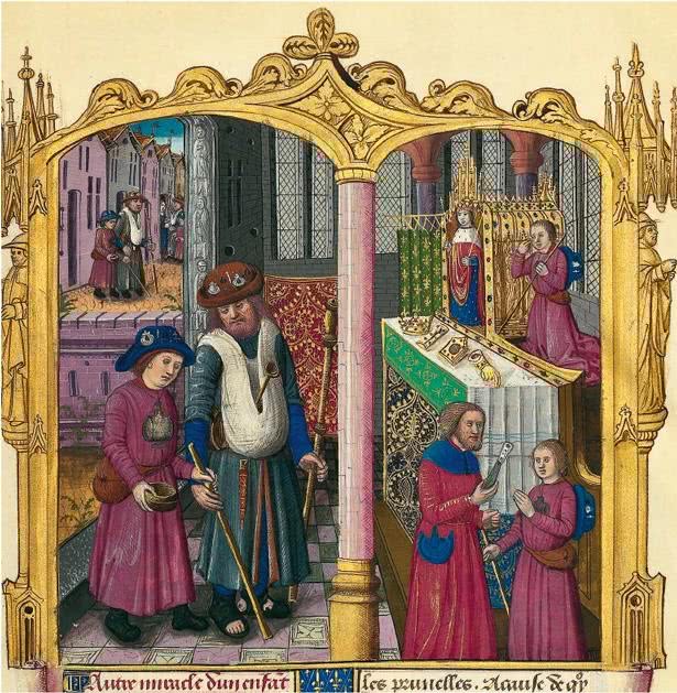 Рис. 4. Семилетний мальчик Тома, который ослеп и был вынужден нищенствовать, отправился за исцелением к мощам короля Людовика IX Святого в аббатство Сен-Дени. Он приложил кольцо к реликварию со святыми останками, а потом к глазам. Из глаз и рта пошла кровь, и он прозрел. На этой миниатюре слева другой паломник приводит его в монастырь. Оба одеты в дорожные шляпы. К ним пришиты паломнические значки – знаки тех святынь, где они побывали, и одновременно защитные амулеты. Справа мы видим, как мальчик забирается к реликварию со статуей святого монарха, а перед ней на алтаре лежат другие реликвии. Среди них – корона, в которую, как считалось, была вставлена колючка из тернового венца Иисуса, а также гвоздь, которым он был прибит ко кресту.