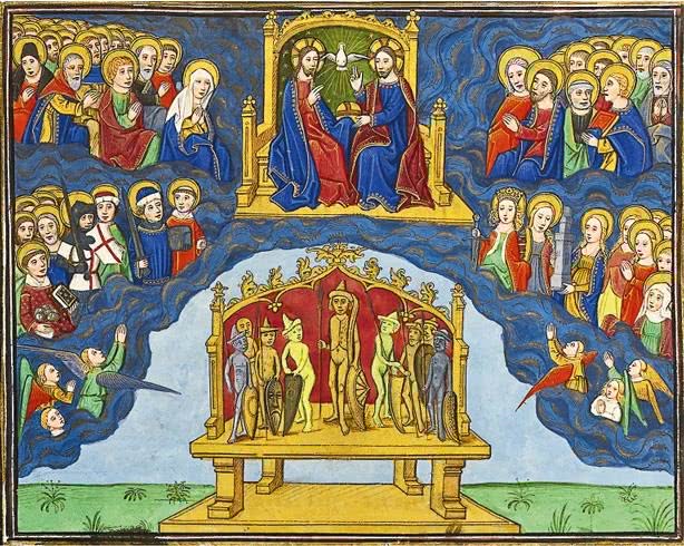 Рис. 7. На этой миниатюре, украшающей «Золотую легенду» – сборник житий святых, который был необычайно популярен в позднее Средневековье, христинский «пантеон» противопоставлен языческому, истинная вера – ложной. На небесном престоле восседает Троица, а вокруг выстроились сонмы святых. На земле стоит стол-алтарь, на котором собрались девять идолов. Христианский Господь, единый в трех ипостасях, и святые изображены как живые, в красках, языческие боги больше похожи на статуи. Их тела монохромны. Это лишь истуканы, созданные руками человека.