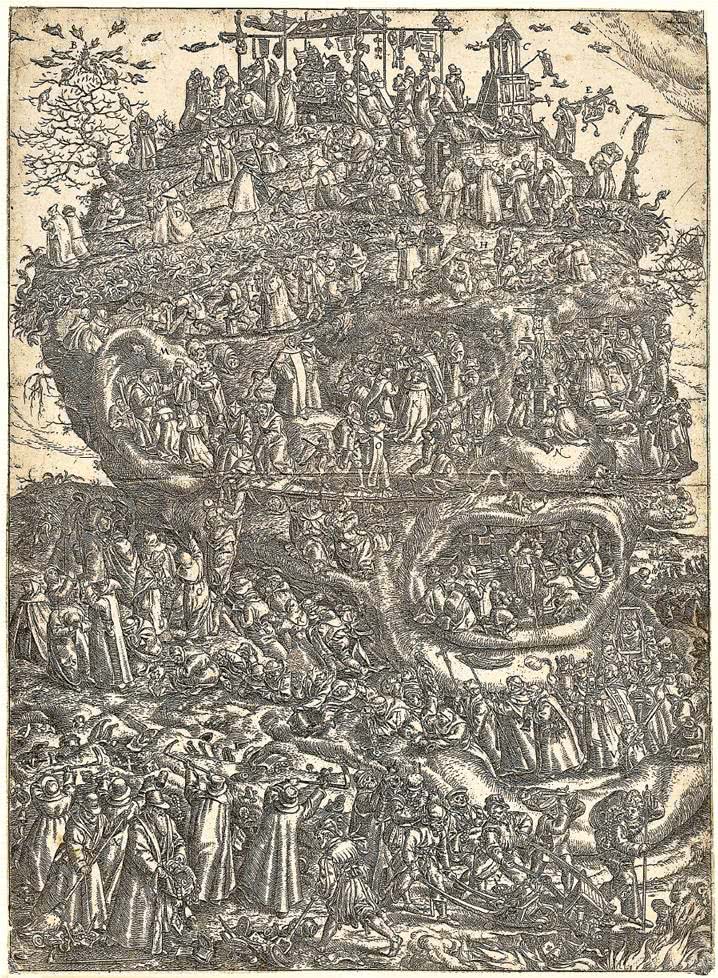 Рис. 8. Вскоре после иконоборческого восстания, вспыхнувшего в Испанских Нидерландах в 1566 г., Маркус Герардс Старший, который был убежденным кальвинистом, создал сатирическое изображение католической церкви, ее иерархии и семи таинств. Он показал «разлагающуюся» голову монаха, на которой, словно на огромной горе, копошатся десятки клириков. На макушке под балдахином восседает папа римский, окруженный грамотами индульгенций, кардинальскими шапками и епископскими митрами. Это источник его богатства – вокруг монахи несут ему мешки со звонкой монетой. Во рту чудовища священник служит мессу, а в ухе слушает исповедь. В одной глазнице епископ рукополагает священника, а в другой священник сочетает мужчину и женщину браком.