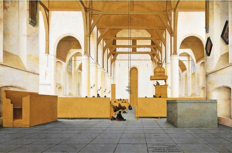 Рис. 9. Кальвинистский храм в Северной Голландии. Никаких изображений: ни фресок, ни створчатых алтарей, ни цветных витражей с фигурами. Беленые стены, прозрачное стекло в окнах. В правом верхнем углу видны только два герба. В глубине прихожане слушают проповедь. Такие картины, каких сохранилось немало, не всегда отражали реальный облик церквей, очищенных от следов католического «идолопоклонства». Некоторые из них лишались только части убранства, а вопрос о том, что убирать, а что оставлять (статуи святых демонтируем, а как быть со скульптурой надгробий?), становился предметом конфликтов и торга. В любом случае перед нами кальвинистский идеал: торжество слова над образом, дематериализация сакрального.
