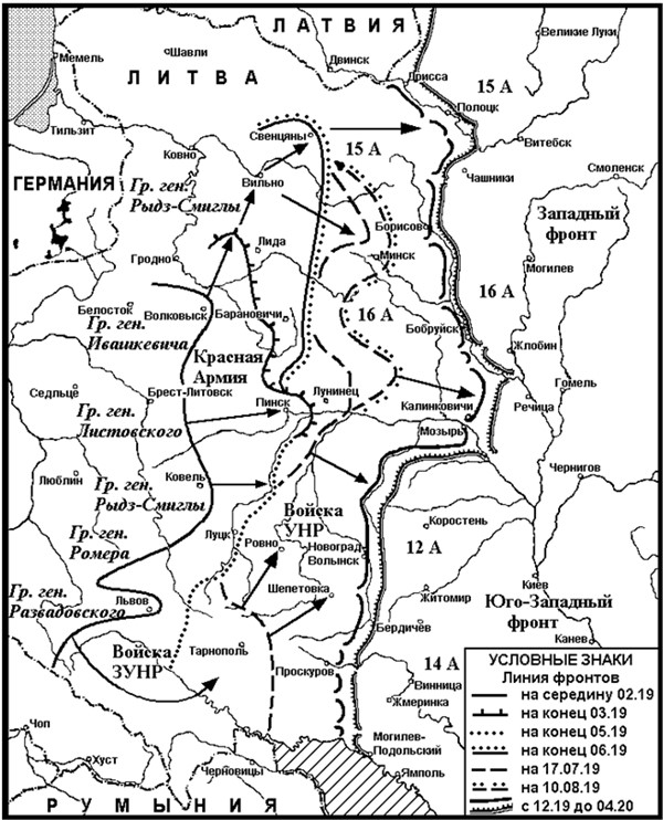 Пока в Галиции разворачивались все эти события, войска 12‐й советской армии, переданной 4 июня в состав Западного фронта из расформированного Украинского фронта, в середине июня 1919 г. на пинском и ковельском направлениях вошли в соприкосновение с польскими частями. Однако пока на Украине основным противником Красной армии были войска УНР, которые, объединившись с Галицийской армией и используя успехи Добровольческой армии А.И. Деникина в Донбассе, перешли в наступление и стали занимать Правобережную Украину. Тем временем на Волыни поляки 9 августа захватили Дубно и Кременец, а 13 августа – Ровно. 1 сентября было подписано перемирие между Польшей и УНР. К середине октября 1919 г. 12‐я армия удерживала район Мозырь – Житомир – река Тетерев, будучи охваченной с трех сторон: с запада действовали польские части, с юго-запада – петлюровцы, а с юго-востока – Добровольческая армия Деникина. В ноябре – декабре 1919 г. польские части использовали отвод войск Деникина для продвижения на линию реки Уборть – Олевск – Новоград-Волынский – Проскуров – Каменец-Подольск. В свою очередь 12‐я армия в ноябре 1919 – феврале 1920 г. совместно с 14‐й армией освободила Правобережную Украину и вошла в соприкосновение с польскими войсками от Полесья до Днестра. Галицийская армия 6 ноября 1919 г. подчинилась Деникину, а в январе 1920 г. – Красной армии[54].