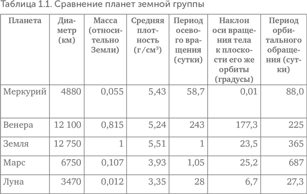 Четыре внутренние планеты Солнечной системы – Меркурий, Венера, Земля и Марс – объединяются в земную группу. Они состоят из металлического ядра и силикатных мантии и коры, в отличие от планет-гигантов. Луна, хотя и не является планетой, по химическому составу также близка к планетам земной группы (рис. 1.2).