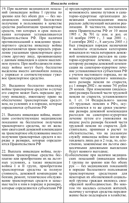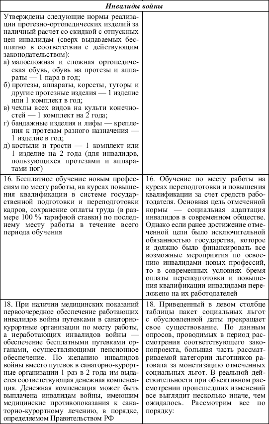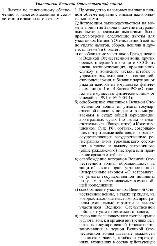 За рамками приведенной сводной таблицы льгот прошлого и мер социальной поддержки как гарантий социального статуса в будущем остались военнослужащие, проходившие военную службу в воинских частях, учреждениях, военно-учебных заведениях, не входивших в состав действующей армии, в период с 22 июня 1941 г. по 3 сентября 1945 г. не менее 6 месяцев, военнослужащие, награжденные орденами или медалями СССР за службу в указанный период; лица, награжденные знаком «Жителю блокадного Ленинграда»; лица, работавшие в период Великой Отечественной войны на объектах противовоздушной обороны, местной противовоздушной обороны, строительстве оборонительных сооружений, военно-морских баз, аэродромов и других военных объектов в пределах тыловых границ действующих фронтов, операционных зон действующих флотов, на прифронтовых участках железных и автомобильных дорог; члены семей погибших (умерших) инвалидов войны, участников Великой Отечественной войны и ветеранов боевых действий. Выведение их за ее рамки не следует трактовать как пониженный интерес к судьбе обозначенных категорий льготников. Принятие подобного рода решения продиктовано волей законодателя. Последний, начиная с изменений в правовом статусе ветеранов боевых действий и следуя далее по перечню категорий граждан, на которых распространяет свое действие ФЗ «О ветеранах», пошел по проторенному пути. Основная масса перемен в социальном обеспечении ветеранов имеет однотипный характер. В этой связи рассмотрение нововведений в статусе одних автоматически распространяется на статус иных льготников.
