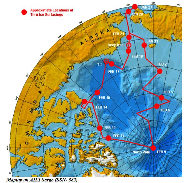 С целью выяснения этого вопроса, а также имея другие, не менее важные задачи, АПЛ ВМС США Sargo (SSN-583) класса Skate под командованием лейтенанта- коммандера John H. Nicholson впервые зимой выполнила транзитный проход Беринговым проливом. По дальнейшему маршруту экипаж изучал Чукотское море и Море Бофорта. Затем лодка всплыла на Северном полюсе (от Лаборатории – Waldo K. Lyon и Arthur Roshon).