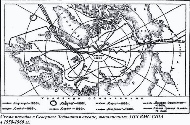 Итоговое представление о степени освоения к 1961 году американскими подводниками Северного Ледовитого океана даёт схема выполненных походов [Осипенко Л., Жильцов Л., Мормуль Н., 24, Турко С. В., 33 и Персональный сайт Михаила Никольского, 60].