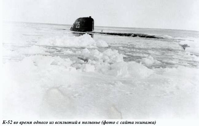 Советский Союз также предпринял очередную попытку проникновения атомных подводных лодок под лёд. АПЛ К-52 капитана 2 ранга Рыкова Валентина Павловича (проект 627А) прошла в апреле подо льдами 516 миль между Землёй Франца-Иосифа и архипелагом Шпицберген до 84-й параллели (старший на борту – командующий Северным флотом адмирал А.Т. Чабаненко). Это было наивысшее достижение советских подводников на то время. К сожалению, мы должны констатировать, что многое об этих сложных первых походах под лёд с несовершенными навигационными приборами, низкой надёжностью атомных энергетических установок и недостаточным опытом экипажей остаётся неизвестным. Оставили воспоминания очень немногие, а обобщающих аналитических работ о той поре нет вовсе. Например, мы не знаем, какие задачи имела К-52, и почему на её борту ходил под лёд сам командующий Северным флотом. Командующий флотом – один из немногих командующих, который не хотел мириться с поставками на флот не надёжных подводных лодок. Думаем, что в этом походе он – подводник хотел убедиться лично, что собой представляют новые «совершенные» подводные лодки. Убедился…