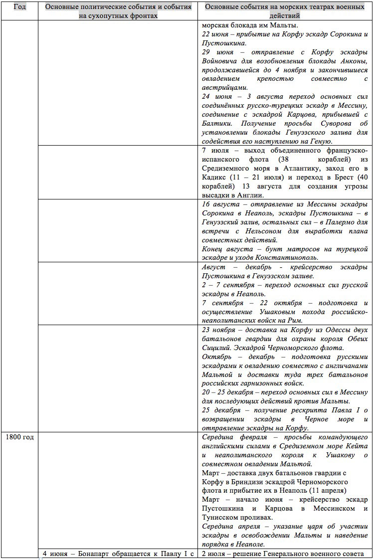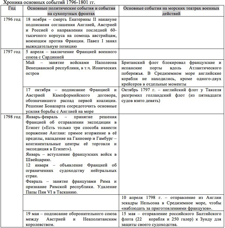 Данная хроника приведена ниже. При этом курсивом выделены те события, которые не нашли отражения, либо искажены в западных источниках и, в частности, в широко известном классическом труде американца А. Т. Мэхэна «Влияние морской силы на французскую революцию и империю. 1793–1812 гг.». Думаем, что проделанная работа должна быть востребована даже современными историками, как образец поведения наших «западных партнёров» в истолковании исторических событий.