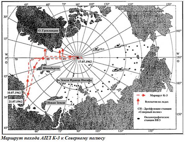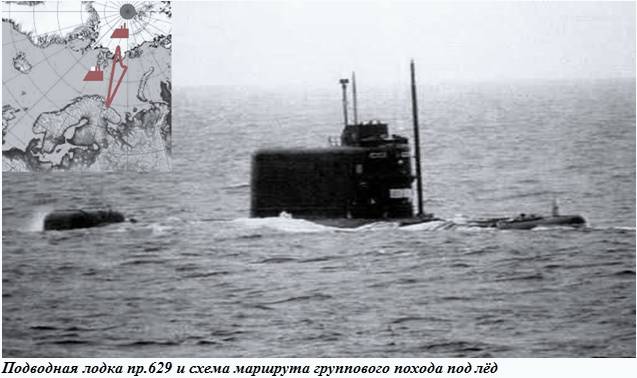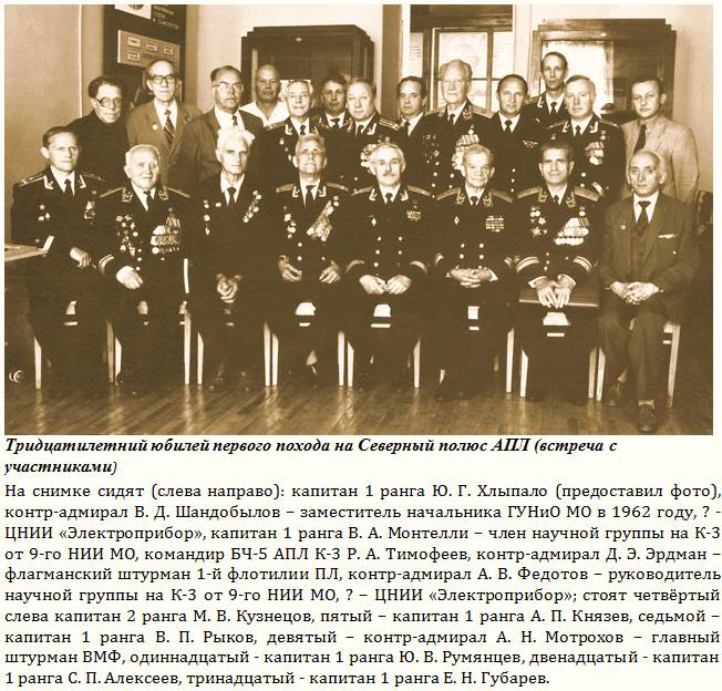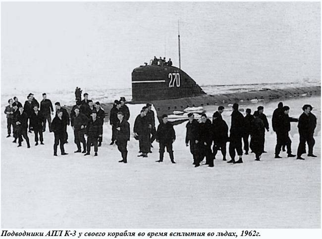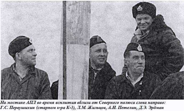 Вот как пишет об этом главком ВМФ адмирал флота Советского Союза С.Г. Горшков в своей книге «Во флотском строю»: «В ходе плаваний шло активное освоение Северного морского пути, подлёдных плаваний подводных лодок и переходов под паковыми льдами из Баренцева моря на Дальний Восток и обратно. Так, в 1962 году атомоход, которым командовал тогда капитан 2 ранга В.Н. Чернавин, имел самую большую среди атомных подводных лодок практику подледных плаваний. На этом корабле отрабатывали методику маневрирования под паковыми льдами, всплытие в полынье и практику предстоящего похода к Северному полюсу. На борту этой лодки выходили контр-адмирал А.И. Петелин (на фото второй слева— Прим. авт.), флагманский штурман флота капитан 1 ранга Д.Э. Эрдман (он был тогда кап. 2 ранга, на фото третий слева; первый слева замполит А. Волошин – Прим. авт.), флагманский инженер-механик М.М. Будаев. Экипаж надеялся, что честь покорения полюса окажут ему, и моряки готовились к этому основательно, но только как дублеры подобно космическим экипажам.