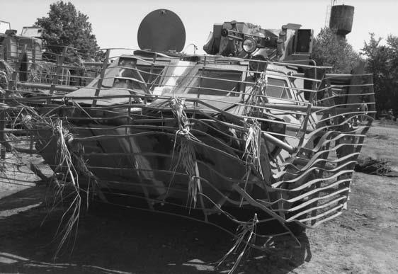 В сети появились фото двух украинских БТР-4Е после боя, со смятыми решетками и гордыми комментариями. Но, судя по всему, противокумулятивные решетки были повреждены не гранатами РПГ, а наездами на какие-то предметы, вроде пней.