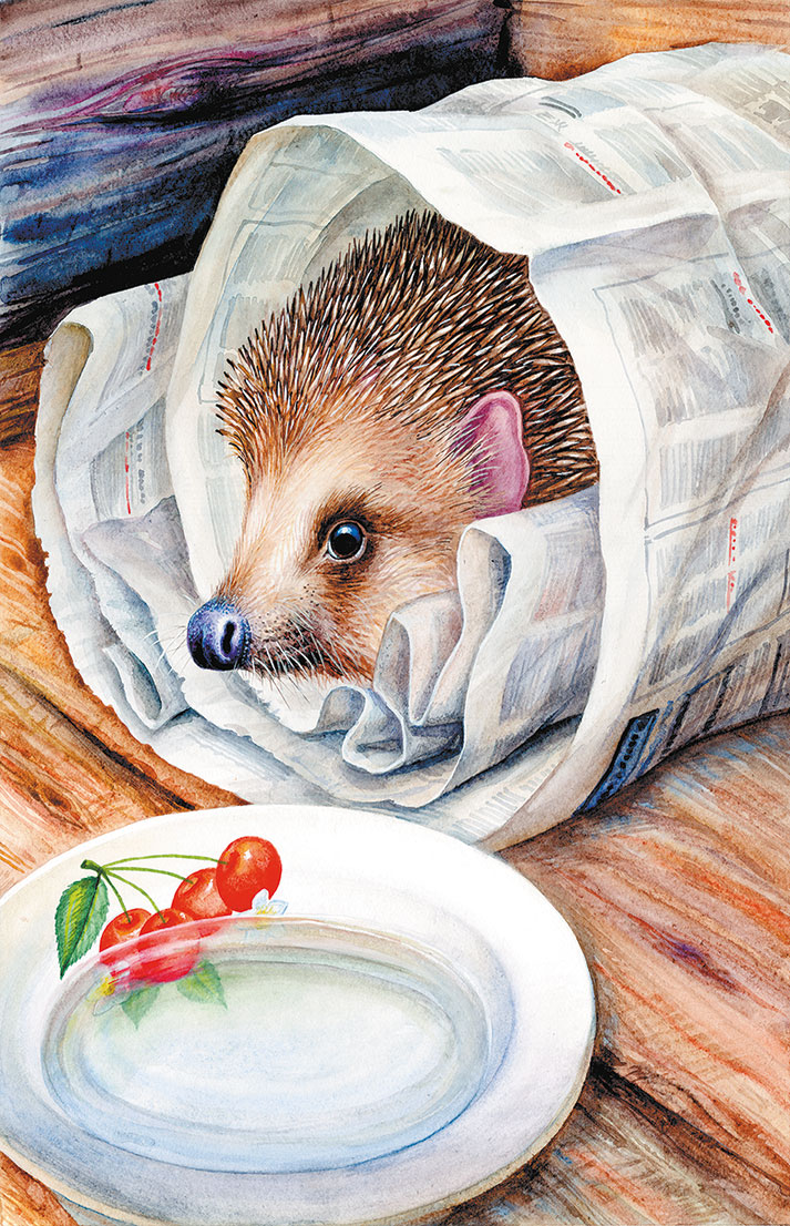Сплю я всегда очень чутко. Слышу – какой-то шелест у меня в комнате. Чиркнул спичкой, зажёг свечу и только заметил, как ёж мелькнул под кровать. А газета лежала уже не возле стола, а посредине комнаты. Так я и оставил гореть свечу и сам не сплю, раздумывая: «Зачем это ёжику газета понадобилась?» Скоро мой жилец выбежал из-под кровати – и прямо к газете, завертелся возле неё, шумел, шумел и наконец ухитрился: надел себе как-то на колючки уголок газеты и потащил её, огромную, в угол.