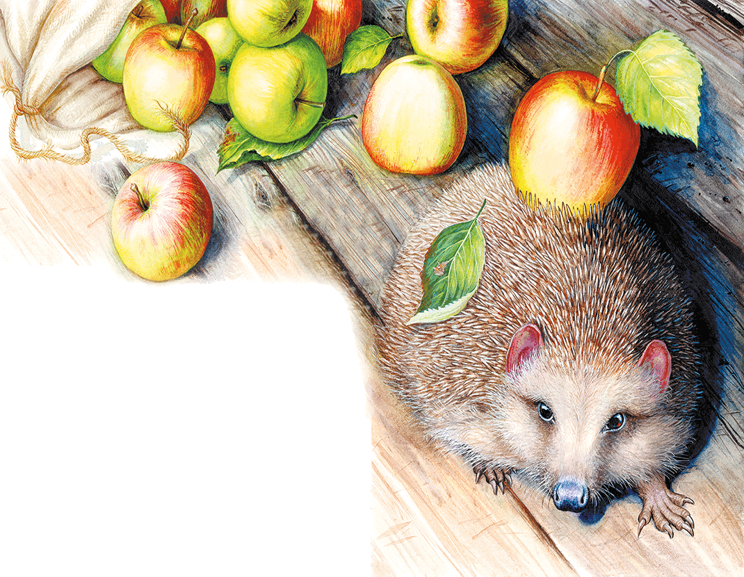 Прибежал в гнездо, сложил его там и за другим бежит в угол, а в углу стоял мешок с яблоками и завалился. Вот ёж подбежал, свернулся около яблок, дёрнулся и опять бежит – на колючках другое яблоко тащит в гнездо.