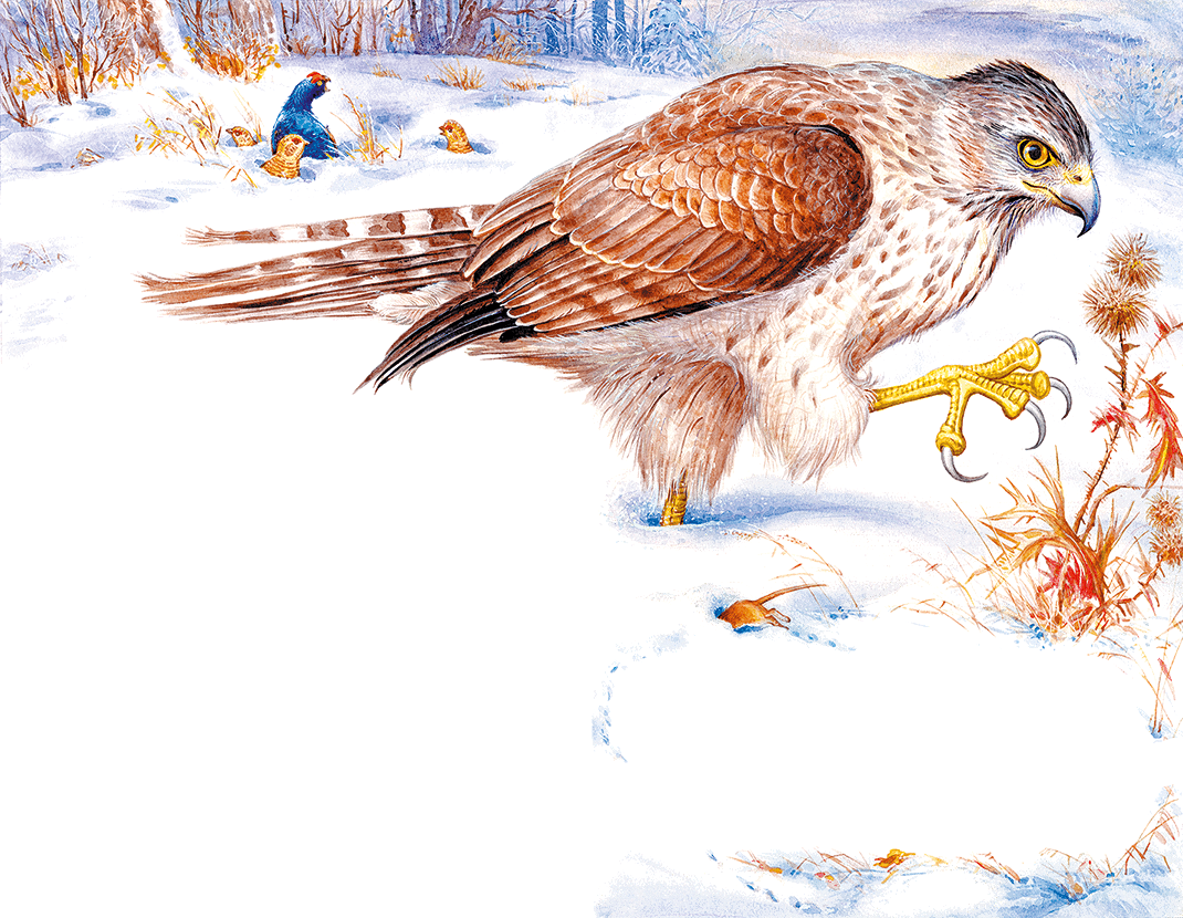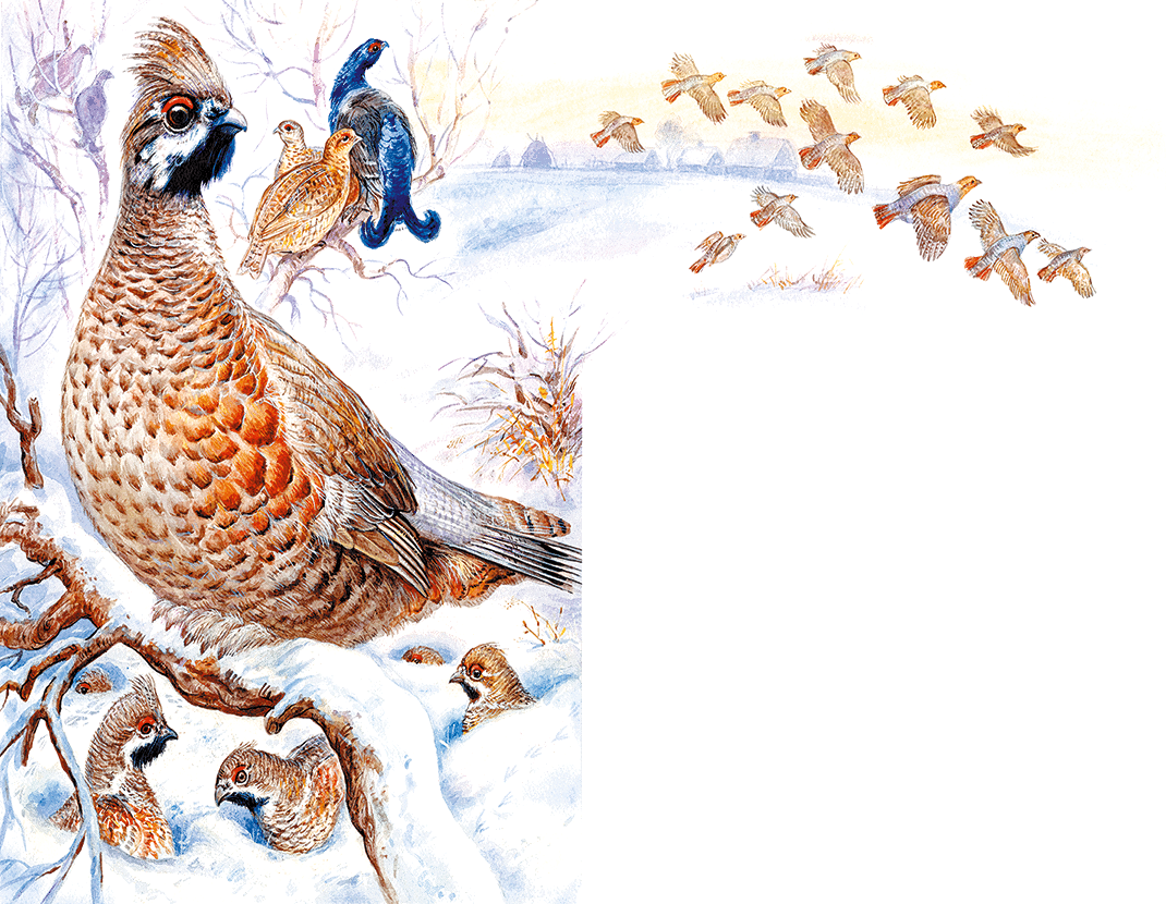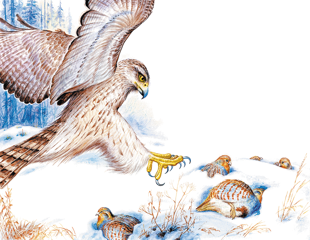 У рябчика в снегу два спасения: первое – это под снегом тепло ночевать, а второе – снег тащит с собой на землю с деревьев разные семечки на пищу рябчику. Под снегом рябчик ищет семечки, делает там ходы и окошечки вверх для воздуха. Идёшь иногда в лесу на лыжах, смотришь – показалась головка и спряталась: это рябчик. Даже и не два, а три спасения рябчику под снегом: и тепло, и пища, и спрятаться можно от ястреба.