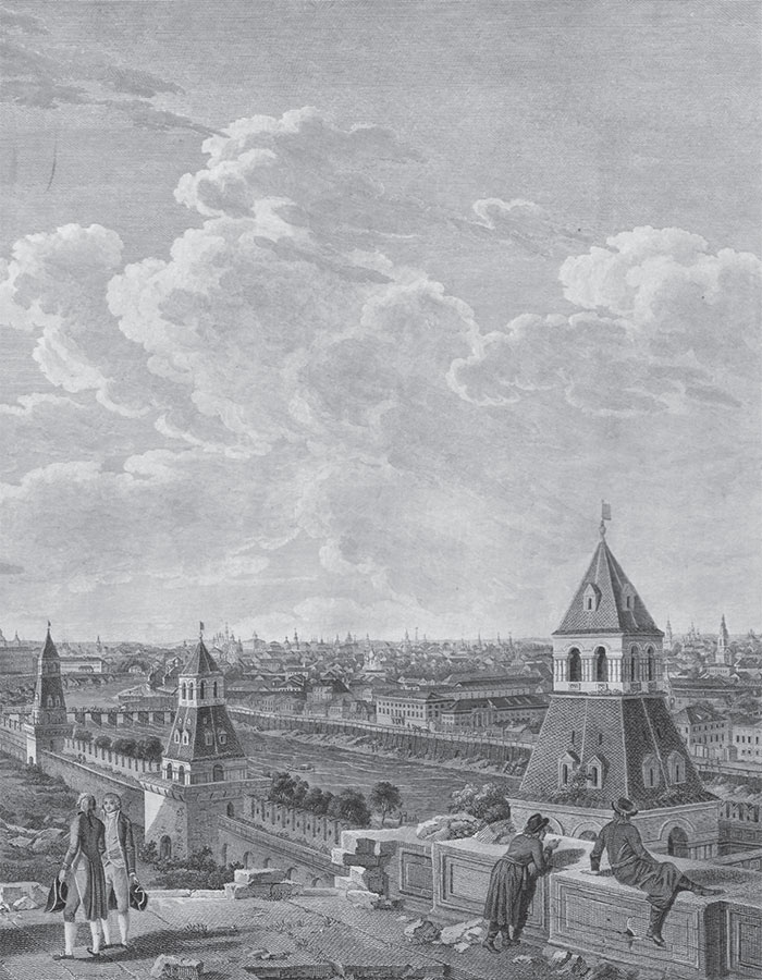 Вид на Москву с балкона Кремлевского дворца в сторону Москворецкого моста. Гравюра Ф. Лорие (?) по рисунку Ж. Делабарта. 1797. Фрагмент