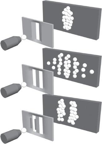В 1803 году Томас Юнг направил пучок света на непрозрачную ширму с двумя прорезями. Вместо ожидаемых двух полосок света на проекционном экране он увидел несколько полос, как если бы произошла интерференция (наложение) двух волн света из каждой прорези. В XX–XXI вв. было показано, что не только свет, но любая одиночная элементарная частица и даже некоторые молекулы ведут себя как волна, будто проходя через обе щели одновременно. Однако если поставить у щелей датчик, который определяет, что именно происходит с частицей в этом месте и через какую именно щель она все-таки проходит, то на проекционном экране появляются только две полосы, словно факт наблюдения (косвенного влияния) рушит волновую функцию и объект ведет себя как материя.