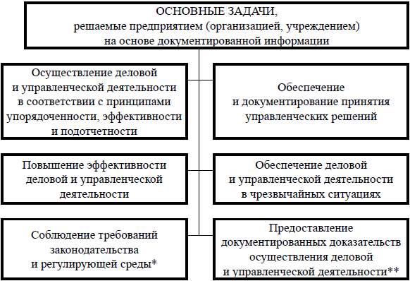Как известно, цель делопроизводства состоит в своевременном, полном и качественном удовлетворении потребностей предприятия в документированной информации (см. рис. 1.1). В свою очередь, Национальный стандарт Р ИСО 15489-1-2007 квалифицирует управление документами как важную составляющую делопроизводства. Следовательно, при организации делопроизводства приоритетной задачей руководителя предприятия (организации, учреждения) либо уполномоченного им подразделения (должностного лица) является создание системы (подсистемы)[4] управления документами.