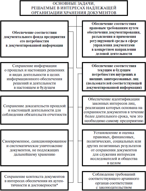Отметим, что в настоящее время сроки хранения документов, относящихся к Архивному фонду Российской Федерации, определяются в соответствии с Федеральным законом «Об архивном деле»[11], а иных документов, образующихся в деятельности предприятий, организаций, учреждений, – соответствующими Перечнями документов[12]. При определении сроков хранения документов непосредственно на предприятии должны учитываться права и интересы всех заинтересованных лиц. Основные задачи, решаемые в интересах надлежащей организации хранения документов, представлены на рис. 1.5.